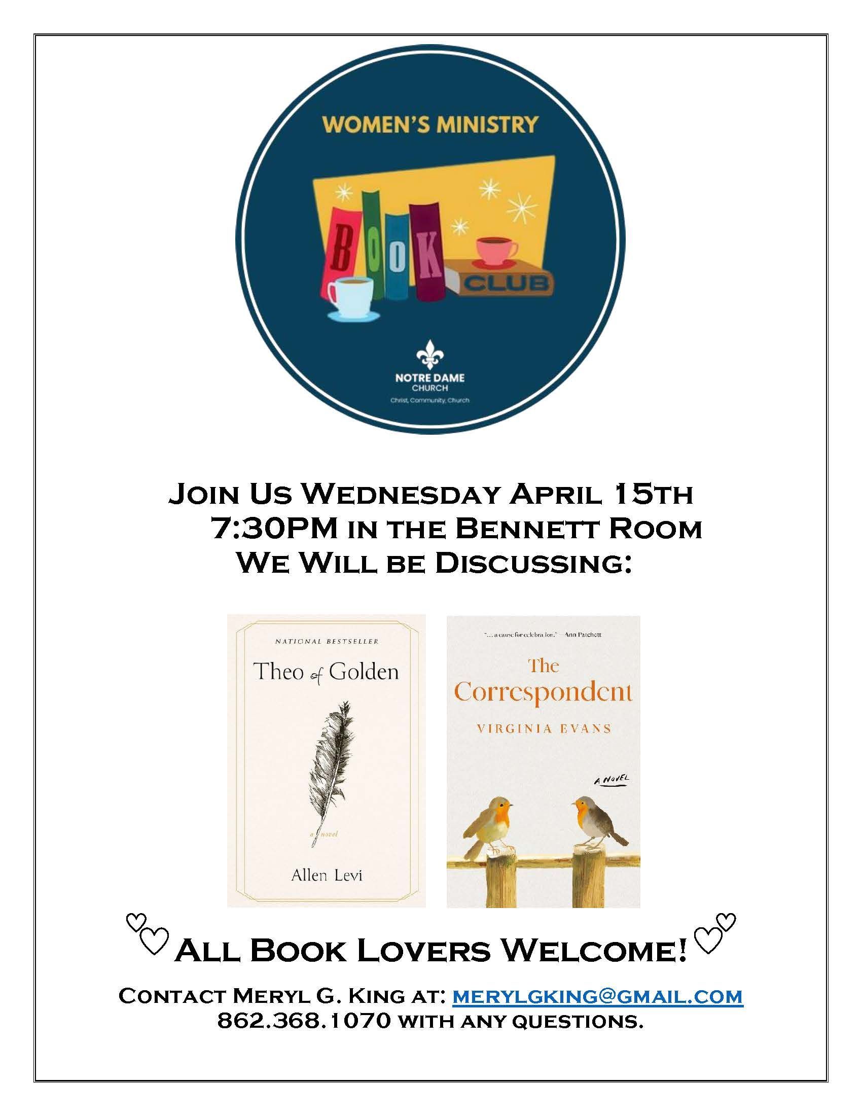 7:30pm Women’s Ministry Book Club - Bennett Room